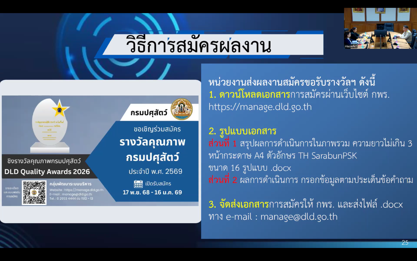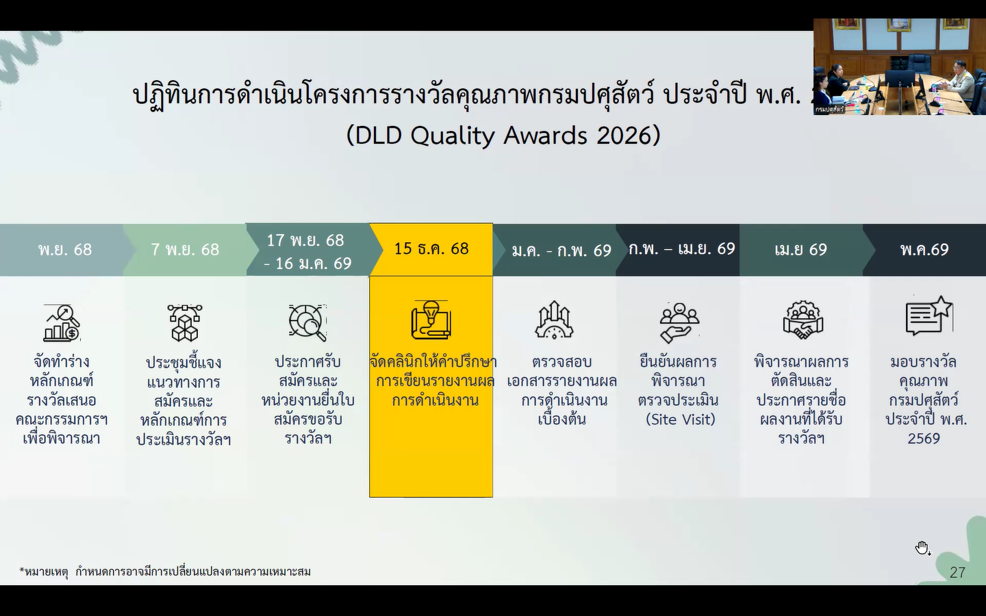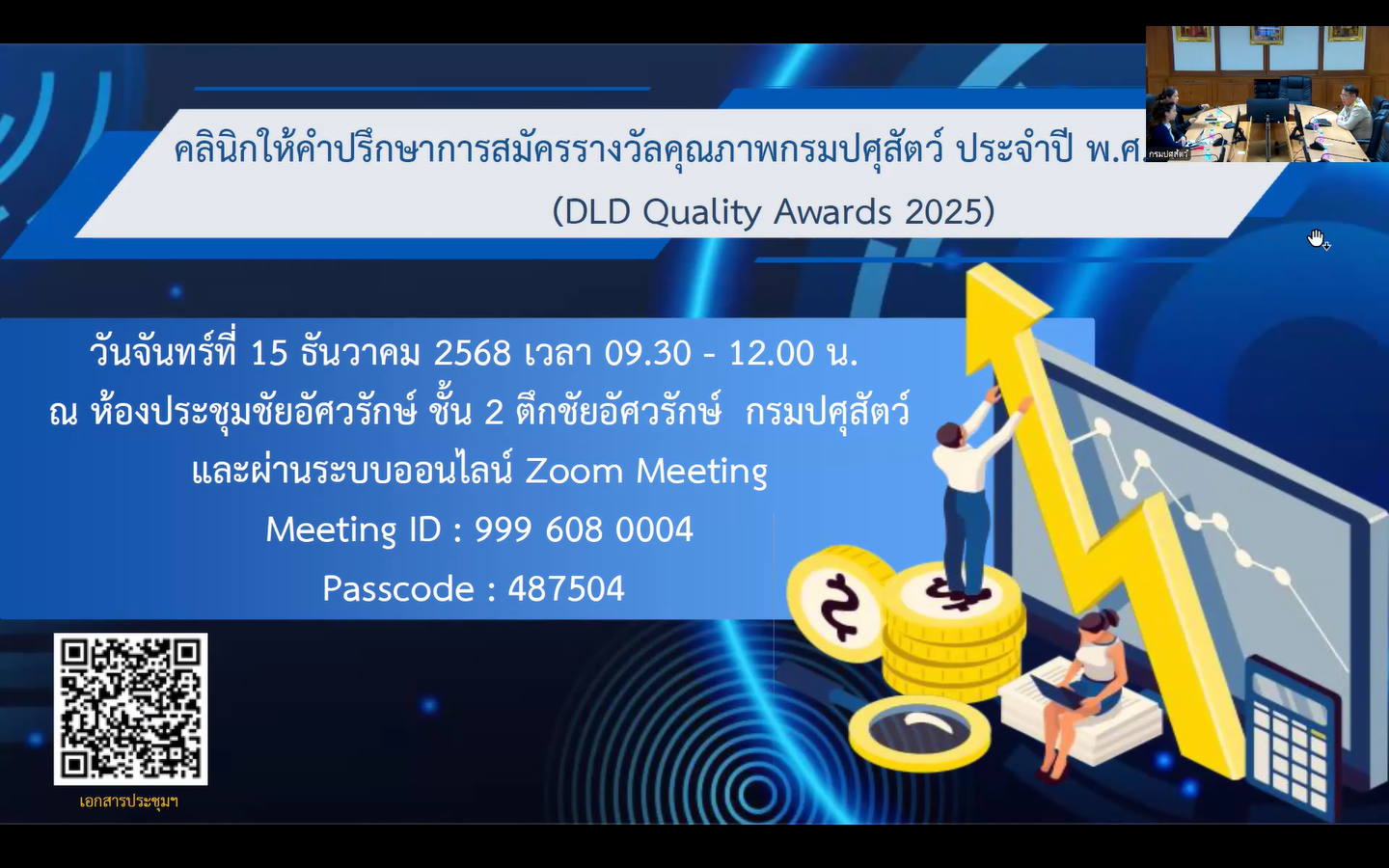 วันจันทร์ที่ 15 ธันวาคม 2568 เวลา 09.30 น. นายพงษ์พันธ์ ธรรมมา รองอธิบดีกรมปศุสัตว์ ประธานกรรมการประเมินผลงานรางวัลคุณภาพกรมปศุสัตว์ มอบหมายให้นายสมเกียรติ กรอบแก้ว หัวหน้ากลุ่มพัฒนาระบบบริหาร เป็นประธานในการจัดคลินิกให้คำปรึกษาการสมัครรางวัลคุณภาพกรมปศุสัตว์ ประจำปี พ.ศ. 2569 (DLD Quality Awards 2026) เพื่อให้คำปรึกษาแก่หน่วยงานในสังกัดกรมปศุสัตว์ เกี่ยวกับเทคนิค/วิธีการในการคัดเลือกผลงาน และการเขียนผลงานส่งสมัครขอรับรางวัลคุณภาพกรมปศุสัตว์ รวมถึงปัจจัยแห่งความสำเร็จในการนำเสนอผลงาน ณ ห้องชัยอัศวรักษ์ ชั้น 2 ตึกชัยอัศวรักษ์ กรมปศุสัตว์ และผ่านระบบ Zoom Meeting