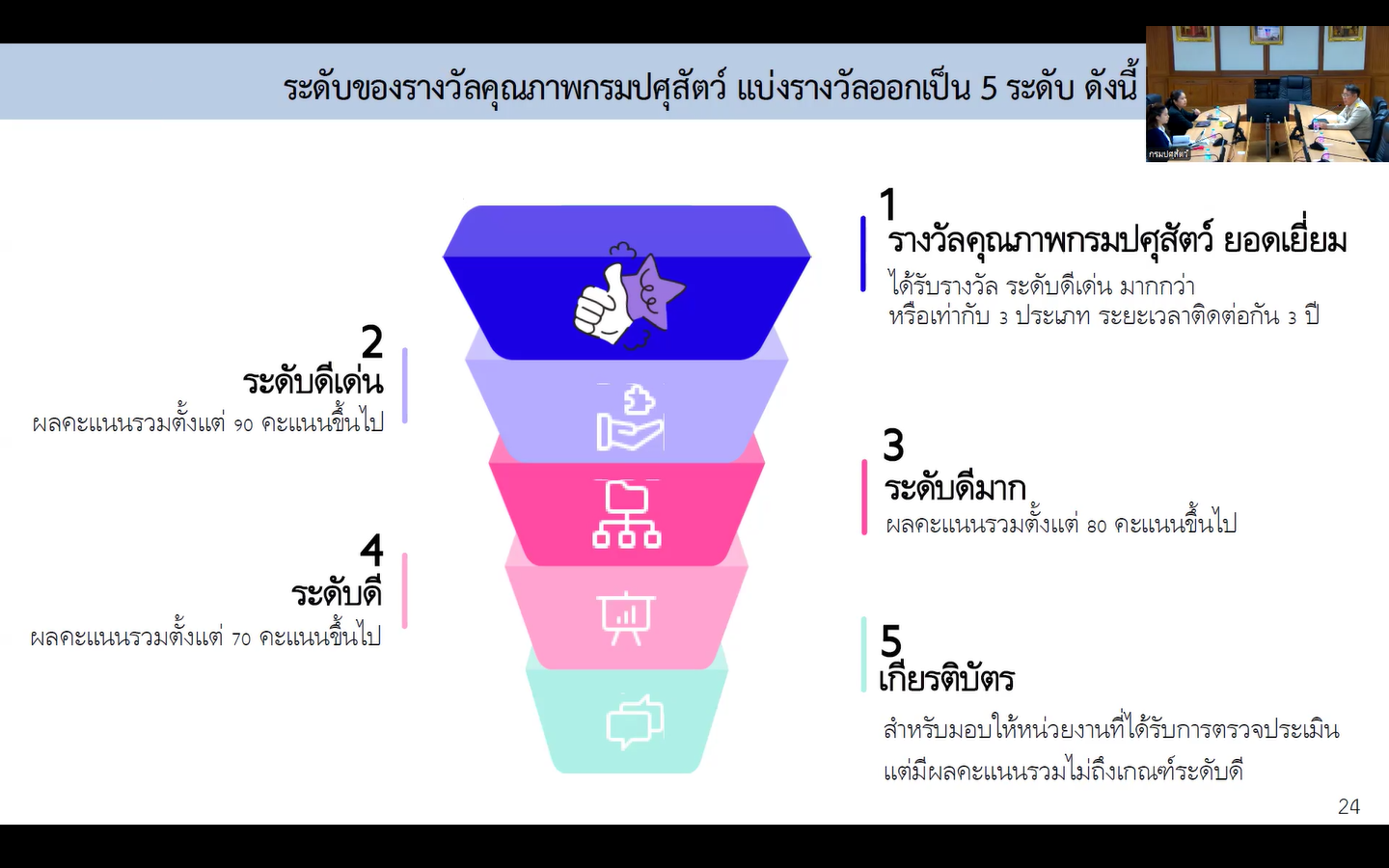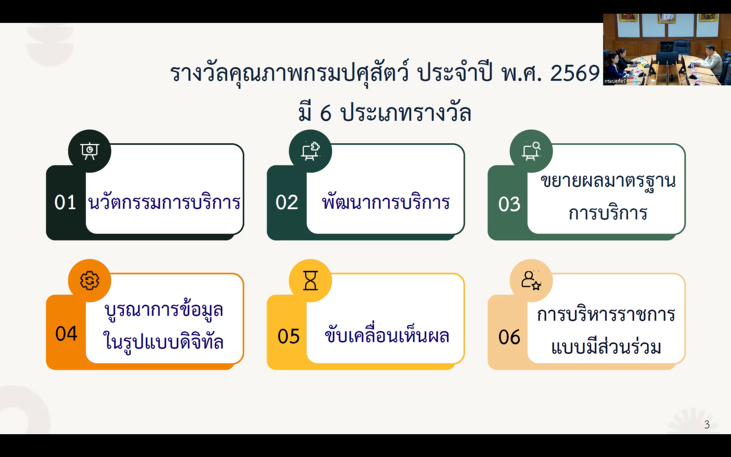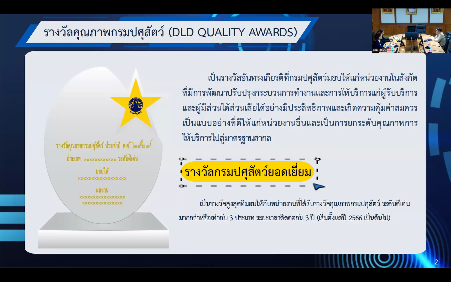 วันจันทร์ที่ 15 ธันวาคม 2568 เวลา 09.30 น. นายพงษ์พันธ์ ธรรมมา รองอธิบดีกรมปศุสัตว์ ประธานกรรมการประเมินผลงานรางวัลคุณภาพกรมปศุสัตว์ มอบหมายให้นายสมเกียรติ กรอบแก้ว หัวหน้ากลุ่มพัฒนาระบบบริหาร เป็นประธานในการจัดคลินิกให้คำปรึกษาการสมัครรางวัลคุณภาพกรมปศุสัตว์ ประจำปี พ.ศ. 2569 (DLD Quality Awards 2026) เพื่อให้คำปรึกษาแก่หน่วยงานในสังกัดกรมปศุสัตว์ เกี่ยวกับเทคนิค/วิธีการในการคัดเลือกผลงาน และการเขียนผลงานส่งสมัครขอรับรางวัลคุณภาพกรมปศุสัตว์ รวมถึงปัจจัยแห่งความสำเร็จในการนำเสนอผลงาน ณ ห้องชัยอัศวรักษ์ ชั้น 2 ตึกชัยอัศวรักษ์ กรมปศุสัตว์ และผ่านระบบ Zoom Meeting