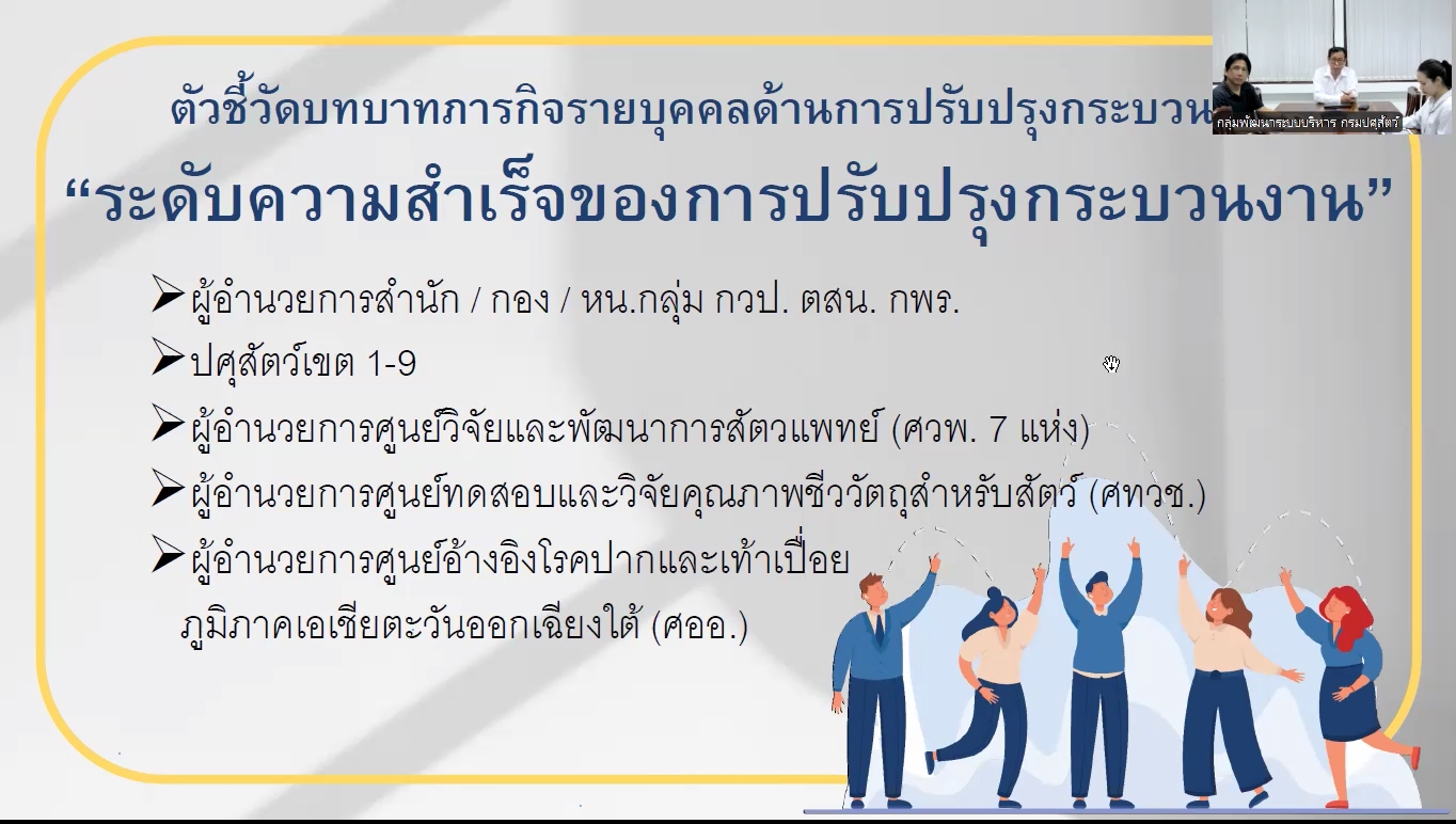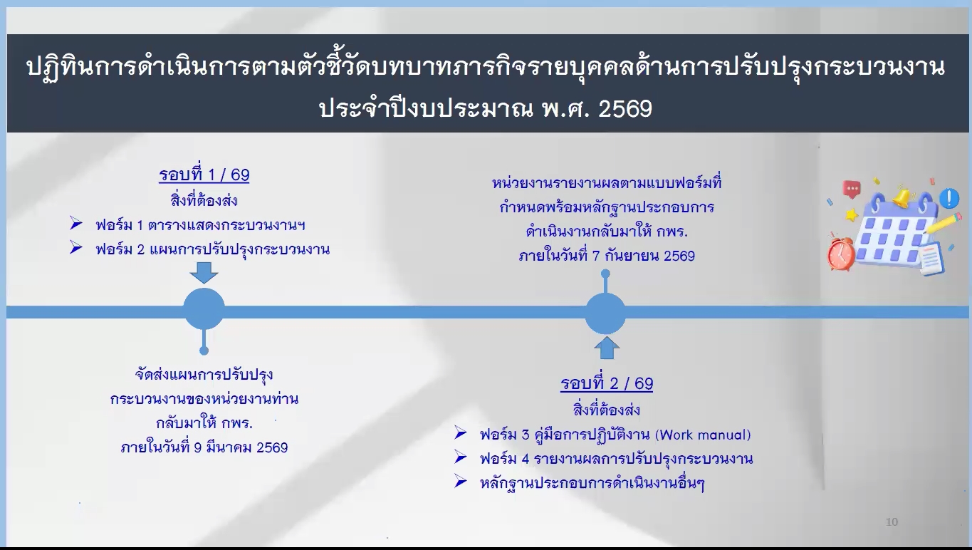วันที่ 14 มกราคม 2569 กลุ่มพัฒนาระบบบริหาร จัดการประชุมชี้แจงรายละเอียดตัวชี้วัดรายบุคคล ด้านการปรับปรุงกระบวนงาน ตามตัวชี้วัด "ระดับความสำเร็จของการปรับปรุงกระบวนงาน" ประจำปีงบประมาณ พ.ศ. 2569 ออนไลน์ผ่านระบบ Zoom Meeting เพื่อชี้แจงรายละเอียดของตัวชี้วัดฯ ให้หน่วยงานรับทราบและเข้าใจแนวทางของการดำเนินการปรับปรุงกระบวนงาน ประจำปีงบประมาณ พ.ศ. 2569