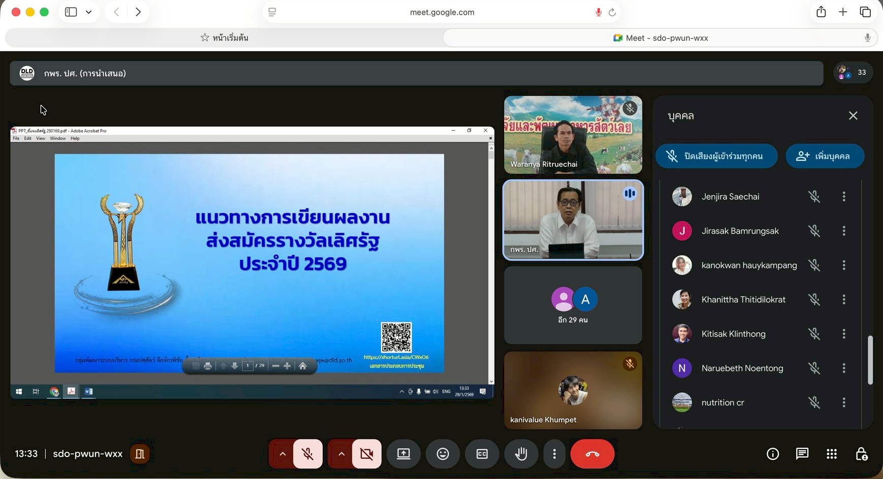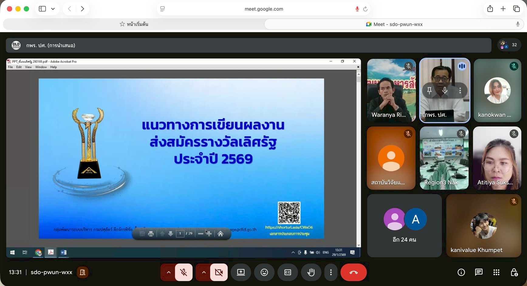วันพฤหัสบดี 29 มกราคม 2569 เวลา 13.30 น. นายสมเกียรติ กรอบแก้ว หัวหน้ากลุ่มพัฒนาระบบบริหาร เป็นประธานในการประชุมหารือแนวทางการเขียนผลงานส่งสมัครรางวัลเลิศรัฐ ประจำปี 2569 เพื่อให้คำปรึกษาแก่หน่วยงานในสังกัดกรมปศุสัตว์ เกี่ยวกับเทคนิค/วิธีการเขียนผลงานส่งสมัครรางวัลเพื่อให้สอดคล้องกับเกณฑ์การประเมินรางวัลเลิศรัฐ ประเภทรางวัลบริการภาครัฐและรางวัลบริหารราชการแบบมีส่วนร่วม รวมถึงปัจจัยแห่งความสำเร็จในการนำเสนอผลงาน ผ่านระบบออนไลน์ Google meet