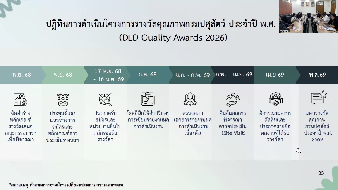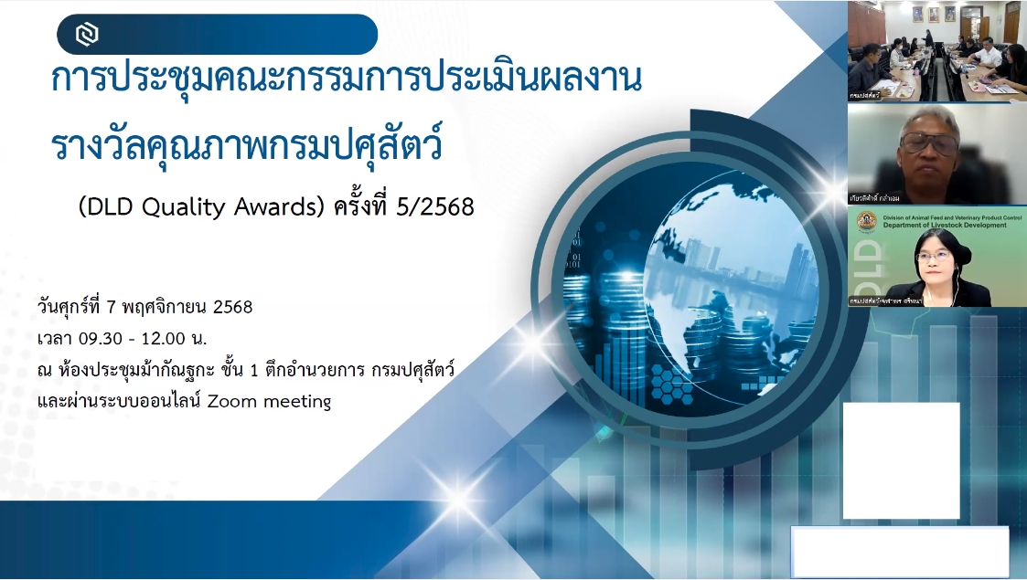 วันที่ 7 พฤศจิกายน 2568 เวลา 09.30 น. นายพงษ์พันธ์ ธรรมมา รองอธิบดีกรมปศุสัตว์ ประธานกรรมการประเมินผลงานรางวัลคุณภาพกรมปศุสัตว์ มอบหมายให้นายสมเกียรติ กรอบแก้ว หัวหน้ากลุ่มพัฒนาระบบบริหาร เป็นประธานการประชุมคณะกรรมการประเมินผลงานรางวัลคุณภาพกรมปศุสัตว์ (DLD Quality Awards) ครั้งที่ 5/2568 โดยคณะกรรมการประเมินผลงานฯ ร่วมกันพิจารณาโครงการรางวัลคุณภาพกรมปศุสัตว์ ประจำปี 2569 (DLD Quality Awards 2026) และหลักเกณฑ์การสมัครรับรางวัลฯ รวมทั้งปฏิทินการดำเนินโครงการรางวัลฯ ณ ห้องประชุมม้ากัณฐกะ ชั้น 1 ตึกอำนวยการ กรมปศุสัตว์ และผ่านระบบ Zoom Meeting
